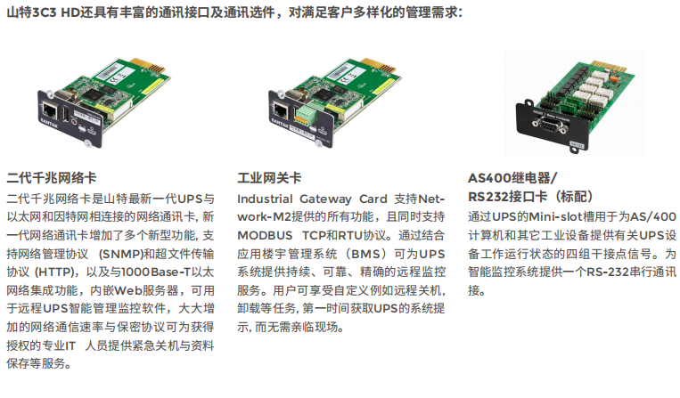 山特3C3 HD UPS支持采用常用的VRLA铅酸电池,搭配山特品牌的城堡C系列电池,高倍率A系列电池和胶体G系列电池,结合山特智能电池管理技术,经过厂内严格的设计、验证、可确保更好的兼容性、品质和电池寿命,为用户在各个不同的应用场景提供更高品质的不间断电力保护。