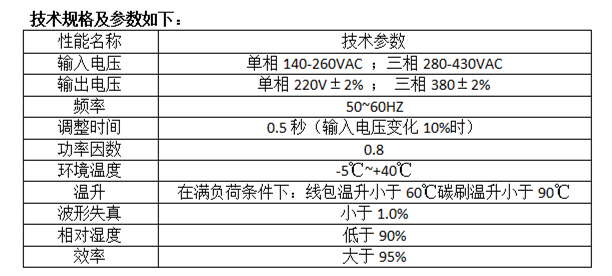 ●输出电压:单相 220V、110V(0.5kVA~1kVA);三相线电压380V,相电压220V