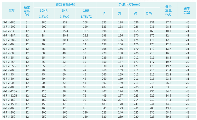 在20℃环境下,FM系列小型密封电池浮充寿命可达3~5年,FM固定型密封电池浮充寿命可达8~10年,FML系列电池浮充寿命可达10年,FMH系列电池浮充寿命可达10年,GFM系列太阳能深循环系列电池浮充寿命可达15年,GFMJ系列电池浮充寿命可达18年。